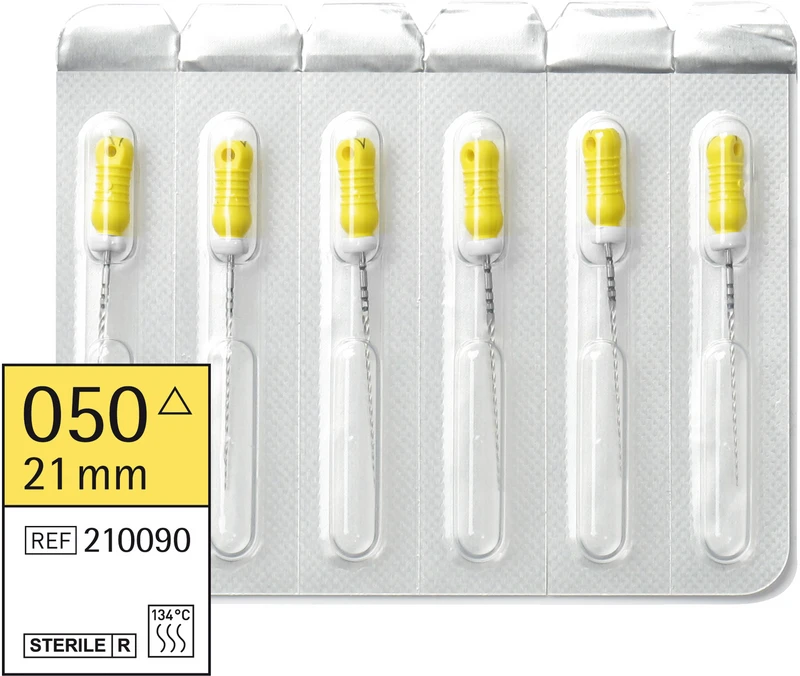 Sterile K-Bohrer fra Omnident er høykvalitets og ISO-konformt nøyaktig produserte endo-instrumenter. De har en meget god skjæreevne og høy bruddstyrke. Instrumentene er fargekodet etter ISO-størrelser og kan steriliseres opp til 134 °C. Håndtaket er rutsjefritt takket være den ergonomiske grepflaten, og instrumentet er dermed trygt å bruke. I en blisterpakke, som sikrer hygienisk enkeltuttak, finnes det 6 sterile instrumenter, som er utstyrt med en silikonstopper. Fargekoding stopper: hvit 21mm, gul 25mm, svart 31mm.