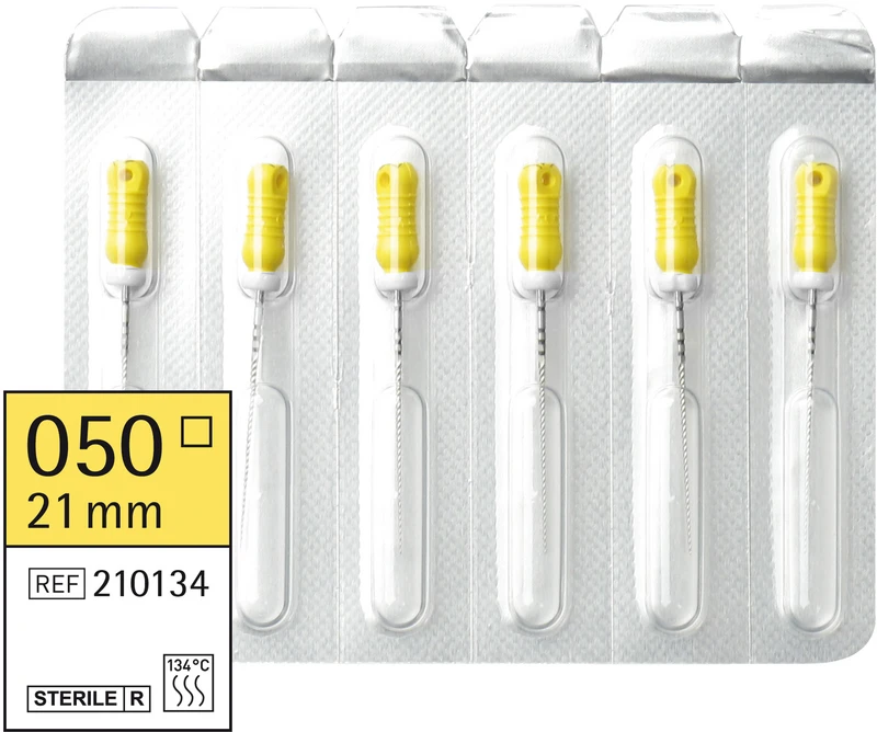 Sterile K-Feilen fra Omnident er høykvalitets og ISO-konformt nøyaktig produserte endo-instrumenter. De har en meget god skjæreevne og høy bruddstyrke. Instrumentene er fargekodet etter ISO-størrelser og kan steriliseres opp til 134 °C. Håndtaket er rutsjfast takket være det ergonomiske grepflaten, og instrumentet er dermed trygt å bruke. I en blisterpakke, som sikrer hygienisk enkeltuttak, finnes det 6 sterile instrumenter, som er utstyrt med en silikonplugg. Fargekoding plugg: hvit 21mm, gul 25mm, svart 31mm.