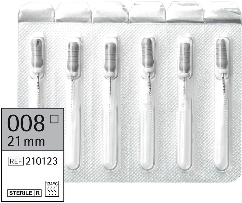 Sterile K-Feilen fra Omnident er høykvalitets og ISO-konformt nøyaktig produserte endo-instrumenter. De har en meget god skjæreevne og høy bruddstyrke. Instrumentene er fargekodet etter ISO-størrelser og kan steriliseres opp til 134 °C. Håndtaket er rutsjfast takket være det ergonomiske grepflaten, og instrumentet er dermed trygt å bruke. I en blisterpakke, som sikrer hygienisk enkeltuttak, finnes det 6 sterile instrumenter, som er utstyrt med en silikonplugg. Fargekoding plugg: hvit 21mm, gul 25mm, svart 31mm.