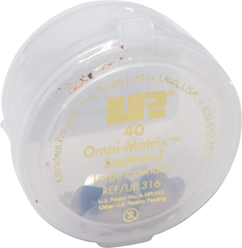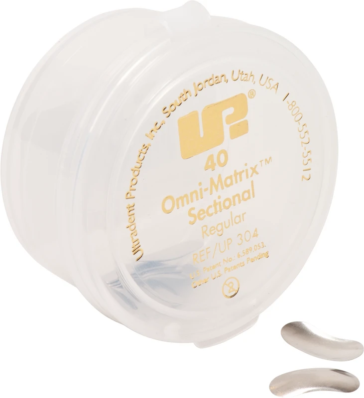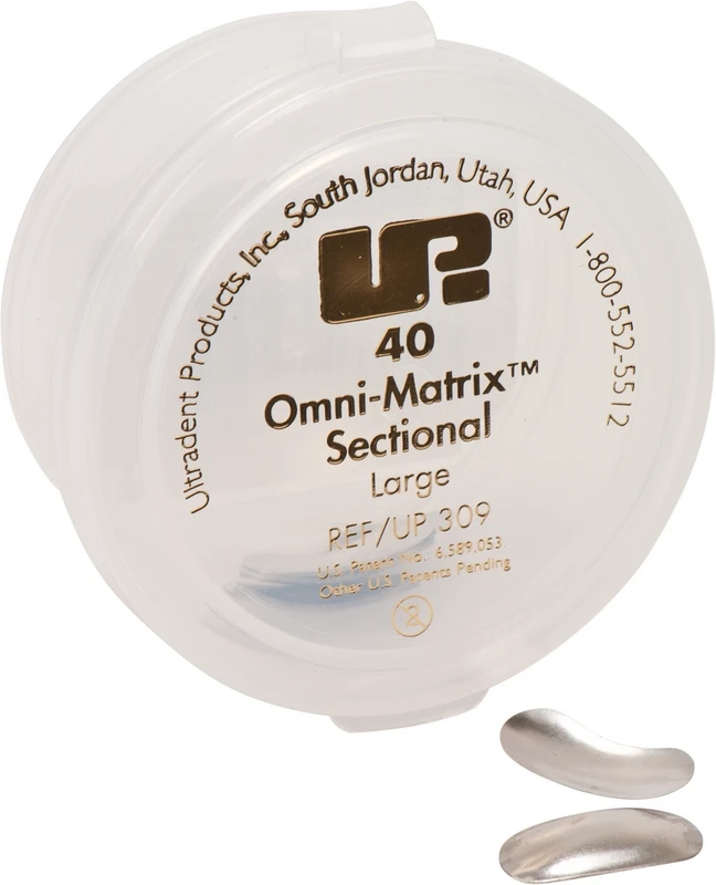 Omni-Matrix™ Sectional er et praksisrettet delmatrisesystem for å oppnå anatomisk korrekte interdentale kontakter. Fire forskjellige matriser er tilgjengelige, anatomisk forhåndskonturert slik at de ikke fester seg ved approksimalkanten og gir optimal tilpasning selv i vanskelige gingivale områder. De tynne båndene (kun 0,025 mm) gir tette kontakter og kan enkelt formes etter enhver tannform. Fjærringen, en løsning for de fleste tilfeller, kan settes med enhver kofferdamklemme-tang. De krummede endene passer perfekt til de bøyde, konvekse tannflatene. Flere fjærringer kan settes etter hverandre slik at de delvis overlapper. Dermed kan flere flater på en tann eller flere tenner i en kjevekvadrant behandles parallelt. Sett alltid fjærringene først etter at matrisene er satt inn OG kilefestet! Matriser og fjærringer kan også kombineres med andre delmatrisesystemer.