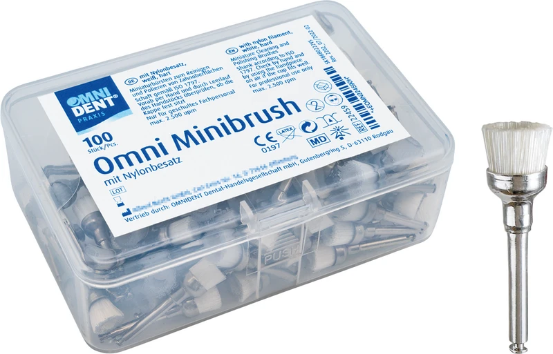 Omni Minibrush med nylonbørster med vinklet skaft, ideell for rengjøring og polering av tannflater.