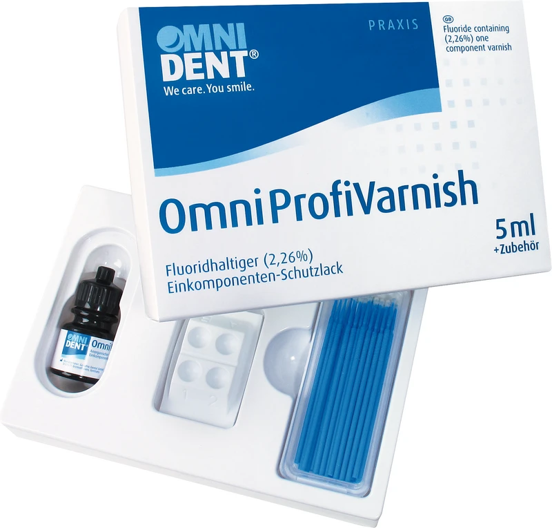 Det Omni ProfiVarnish er et fluoridholdig enkeltkomponent beskyttelseslakk eller –gel, som påføres for å desensibilisere tenner på emalje- og dentinoverflater. Til behandling av hypersensitive tenner, blottlagte tannhalsene og tannoverflater under og/eller etter kjeveortopedisk behandling. Omni ProfiVarnish inneholder, i tillegg til lettløselige fluorider, kalsiumfluorid og fluoroapatitt, som støtter remineraliseringen av tannsubstansen. Omni ProfiVarnish inneholder 22.600 ppm (2,26 %) fluorider.