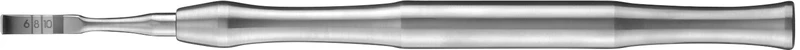 Rett eller buet utførelse (rett = overkjeve, buet = underkjeve). Forskjellige bredder fra 3 til 8 mm, anbefaling for enkelttannimplantater: opptil 4 mm bredde; større kjevekammseksjoner: opptil 8 mm bredde. Dybdemerkinger på meiselen fra 6 mm til 10 mm (svart område = sikkerhetsmarkering fra 10 mm). Anbefaling for bruk: minste kjevekambredde 2-3 mm, minste benhøyde 10 mm, maksimal splittingdybde opptil 70 prosent av total benhøyde.