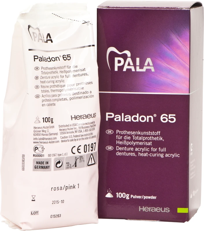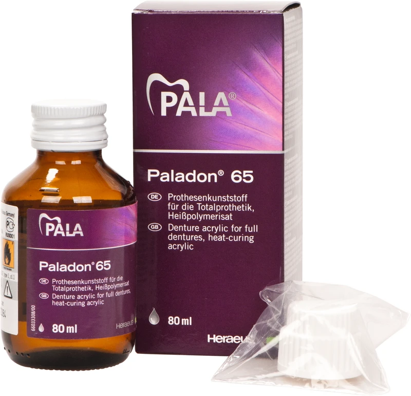 Det legendariske varmepolymerisat. Som oppfinner av varmepolymeriserende protesekunststoffer har Heraeus i 75 år satt standard med det velprøvde Paladon. De stadig videreutviklede mekaniske produktegenskapene gir en svært brukervennlig og variabel bearbeiding og sikrer samtidig på en økonomisk måte produksjon av proteser av høy kvalitet. Paladon® 65 kan bearbeides enkelt uten kompliserte tilleggsenheter.
