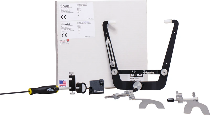 Anatomisk ansiktsbue med avtakbar bittgaffel. Montering av bittgaffel uten ansiktsbue ved hjelp av monteringssko direkte i artikulatoren.