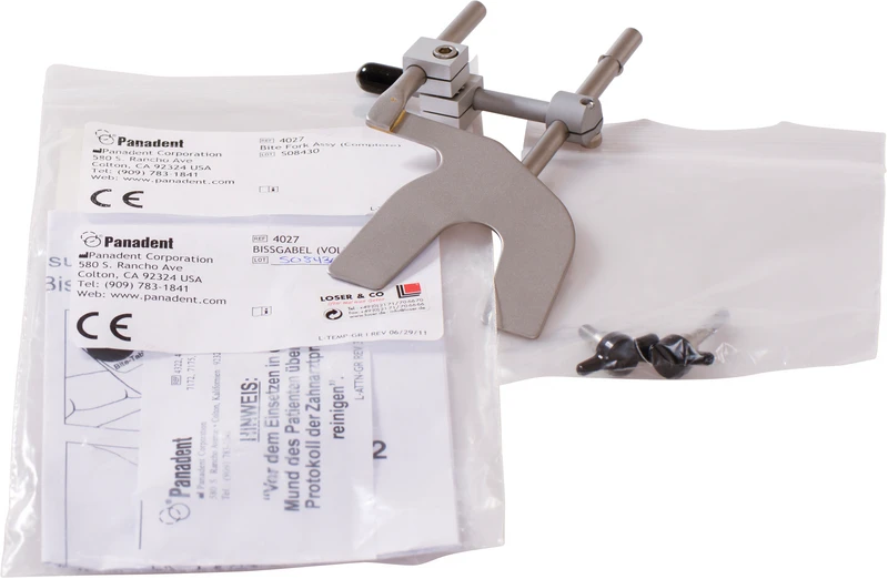 Tilbehør for anatomisk ansiktsbue med avtakbar bittgaffel. Montering av bittgaffel uten ansiktsbue ved hjelp av monteringssko direkte i artikulatoren.