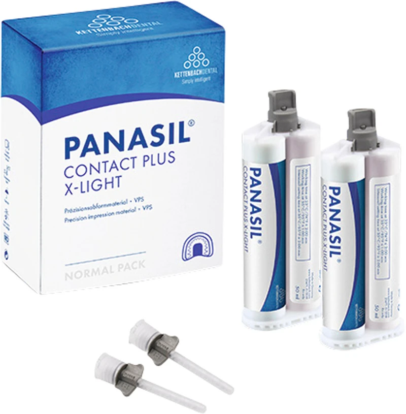 Presis uten kompromiss, det står Panasil® for. Sortimentet har riktig produkt for alle avtrykksteknikker og indikasjoner. Med sine overbevisende produktegenskaper og avstemte produktkombinasjoner lykkes avtrykk også i fuktig miljø med et usedvanlig presist resultat. Panasil®-familien tilbyr tynt-, middels- og tregtflytende samt knetbare presisjonsavtrykkmaterialer på A-silikonbasis. Panasil® contact er en light body på A-silikonbasis for presisjonsavtrykk. Herdingskarakteristikken til de to produktene er slående: en slutt på herdingen kan oppnås allerede etter 2 minutter. Svært tynnflytende, lilla.