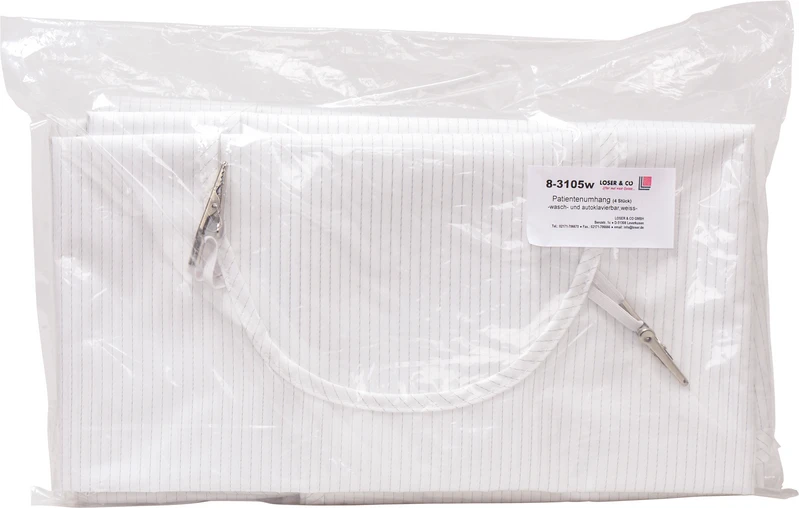 Denne profesjonelle beskyttelsen for dine pasienter kan lett og raskt settes på ved nakkevelcro. To metallklips gjør det mulig å feste en ekstra papirserviett. Beskyttelseskappen er vaskbar, desinfiserbar og kan autoklaveres. Den har antimikrobiell behandling, er væsketett (bestandig også mot aggressive væsker) og bakterietett (99,998 %).