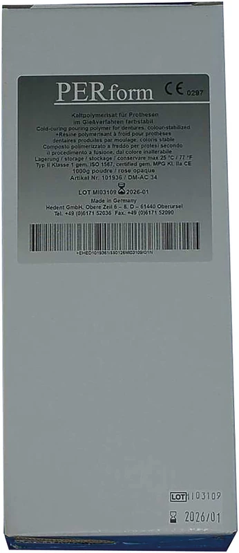 Varmpolymerisat av plast for proteser i PERform-Inkovac-polymerisasjonssystemet og i modellstøpteknikk. PERform plast er spesielt utviklet for støpeteknikk og kjennetegnes av spesielt gode flyteegenskaper. Det er et fargestabilt polymetylmetakrylat med barbitursyre-katalysatorsystem. Restmonomer under 1 %.