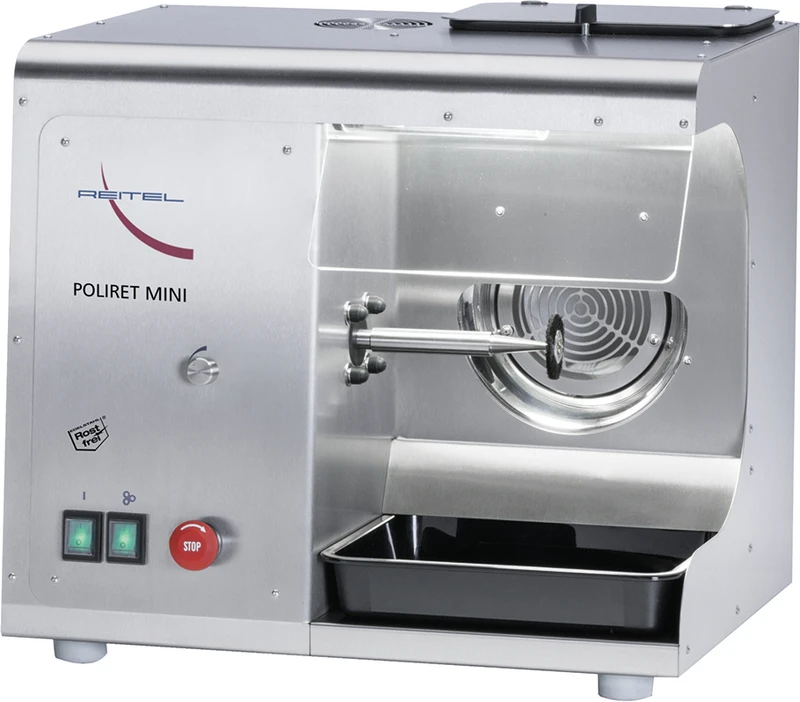 Den kompakte poleringsenheten POLIRET MINI med liten plassbehov og en høyresidig poleringspindel muliggjør sliping, polering, rengjøring og børsting av metall- og plastgjenstander. Arbeidskaret i plast er enkelt å ta ut og lett å rengjøre. Høy økonomi og valgfri materialtilpasning oppnås ved trinnløs turtallsregulering med en kraftig 600 W motor. Alle rustfritt stål-varianter av Poliret-serien kan plasseres komfortabelt og plassbesparende direkte mot vegg, da avsugsluften føres oppover.