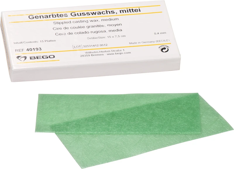 Velprøvd voks for modellering av modellgussbaser i overkjeveområdet. Preget overflate gir basen et naturlig utseende og forbedrer tungens følelse. Lett å tilpasse og fester seg uten ekstra voks-lim til innleggsmassemodellen. Det pregete støpevokset finnes i tre forskjellige overflatestrukturer – fra fin til grov – og muliggjør individuell overflateutforming etter behandlerens anvisning. Den individuelle pregningen av den støpte modellgussbasen gjør det lettere å feste mat og reduserer fremmedkropps-følelsen for pasientens tunge. Størrelse 15 x 7,5 cm.