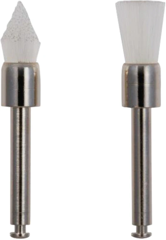 Nylonbørster med vinkelstykke i begerform eller spiss, med en børstelengde på 7 mm og en diameter på 5 mm. For fjerning av plakk og polering av restaureringer og naturlige tenner.