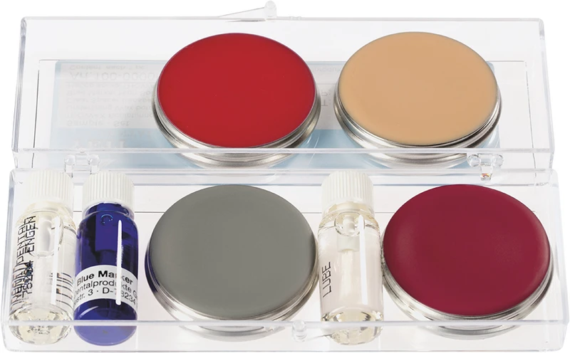 <b>Sett</b> 4 vokser (modellervoks grå og beige, underliggende voks bordeaux, cervikalvoks rød), 3 væsker (Clear Spacer klarlakk, Lube isolasjon, Blue Marker kontaktfarge)