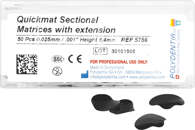 Quickmat DELUXE er et nytt delmatrisesystem som muliggjør presise og anatomisk korrekte kontaktpunkter ved Klasse-II-restaureringer. Delmatrisene i rustfritt stål finnes i svært tynne (0,025 mm), tynne (0,04 mm) samt for premolar og molar. Tillegg inkluderer Quickmat DELUXE et stort utvalg av trekiler i forskjellige størrelser samt autoklaverbare Quickringe. Pakningen er rikelig utstyrt og gir dermed et usedvanlig optimalt kvalitet/innhold/pris-forhold! Quickmat Deluxe-Zange er tilpasset for optimal posisjonering av Quickringene, autoklaverbar. Quickmatrix-Zange brukes for enkel håndtering av delmatrisene, autoklaverbar.