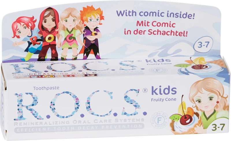 R.O.C.S kids Frukteis er et effektivt middel for beskyttelse mot karies og inneholder ikke fluor. Beskyttelsen mot karies og betennelser sikres av de aktive bestanddelene i MINERALIN Kids®-komplekset og av biotilgjengelige mineraler –kalsiumglycerofosfat og magnesiumklorid (kalsium-, fosfor- og magnesiumkilder). Den høye xylittholdningen (12 %) hemmer kariogene bakterier. Tannkremen har dessuten prebiotiske egenskaper – normaliserer den mikrobielle sammensetningen av munnhulens flora, noe som er spesielt viktig ved dysbiose i munnhulen. Barn i førskolealder må pusse tennene under foreldres tilsyn. Uten tilsetning av natriumlaurylsulfat eller fluor. Lav abrasivitet. Egnet for barn som er disponert for allergier. Tannleger anbefaler bruk av tannkremer uten fluor når det er risiko for for høy fluorinntak i kroppen: