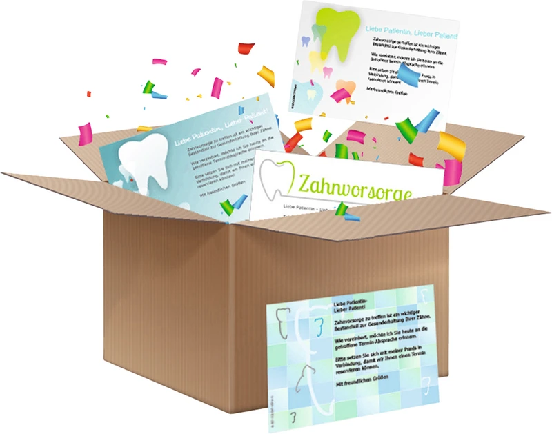Bruk variasjon i pasientkommunikasjonen med Recall-overraskelsespakke for voksne. Denne pakken inneholder 500 tannforebyggingskort og et utvalg av ulike, tiltalende motiver. Ideell for tannleger og medisinsk fagpersonell som ønsker å sende pasientene sine en kreativ påminnelse om kommende kontrolltimer.