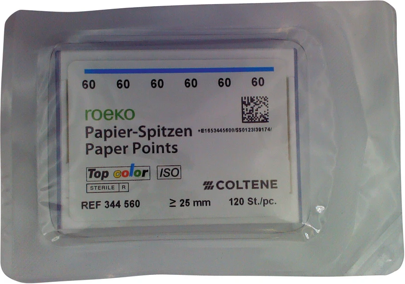 roeko Top color papirspisser kombinerer fordelene med hvite og helt fargede spisser (color). Delvis fargekoding forhindrer forveksling av forskjellige størrelser. Den hvite spissen letter kontrollen av rotkanalrengjøring.