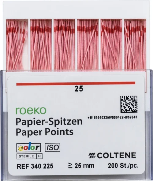 Fargekoding forhindrer forveksling av forskjellige størrelser. Ved kontakt med fuktighet blir fargen på papirspissen mer intens – en optimal kontroll på restfuktighet i kanalen. Natriumhypokloritt eller hydrogenperoksid bleker spissen.