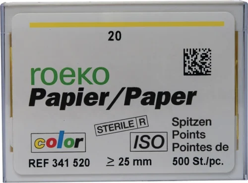Fargekoding forhindrer forveksling av forskjellige størrelser. Ved kontakt med fuktighet blir fargen på papirspissen mer intens – en optimal kontroll på restfuktighet i kanalen. Natriumhypokloritt eller hydrogenperoksid bleker spissen.