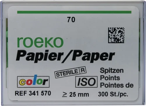 Fargekoding forhindrer forveksling av forskjellige størrelser. Ved kontakt med fuktighet blir fargen på papirspissen mer intens – en optimal kontroll på restfuktighet i kanalen. Natriumhypokloritt eller hydrogenperoksid bleker spissen.