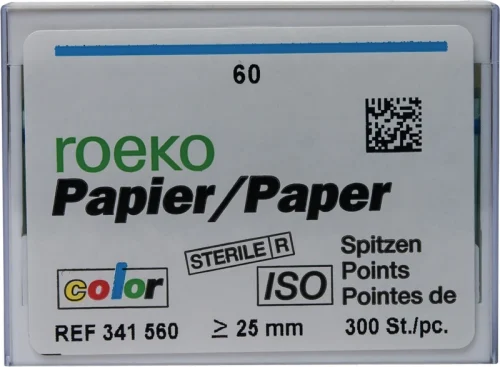 Fargekoding forhindrer forveksling av forskjellige størrelser. Ved kontakt med fuktighet blir fargen på papirspissen mer intens – en optimal kontroll på restfuktighet i kanalen. Natriumhypokloritt eller hydrogenperoksid bleker spissen.