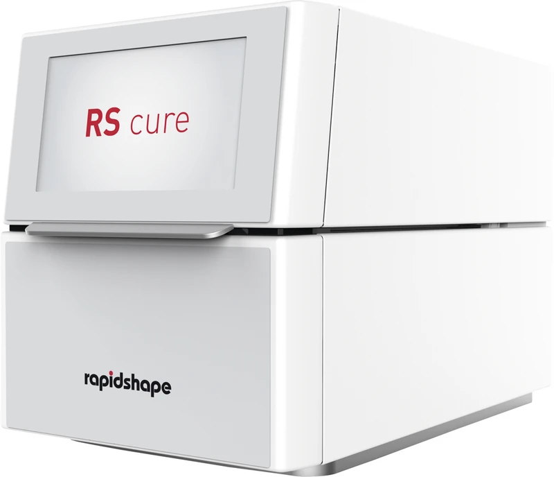 Lysherdeapparat for polymerisering av 3D-printede komponenter på kun 6 – 10 minutter. De kraftige LED-ene i belysningssystemet sørger i kombinasjon med en varmeenhet og vakuum for en 360° homogen herding i UVA- og UVB-området.