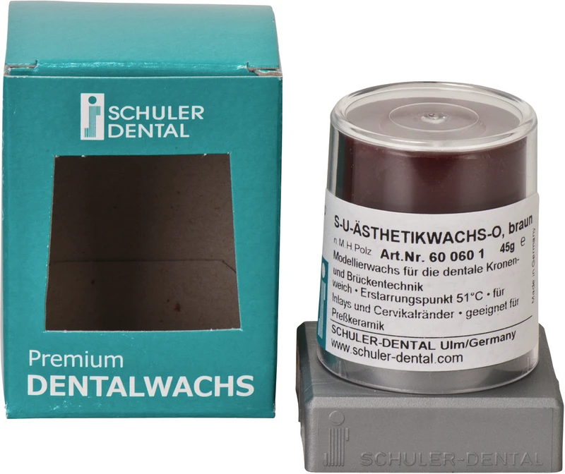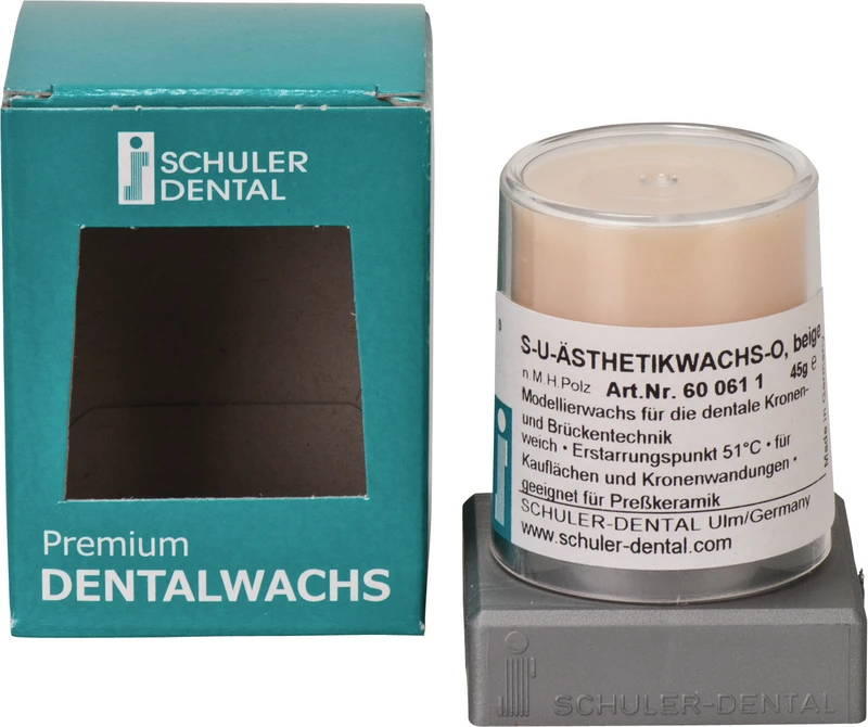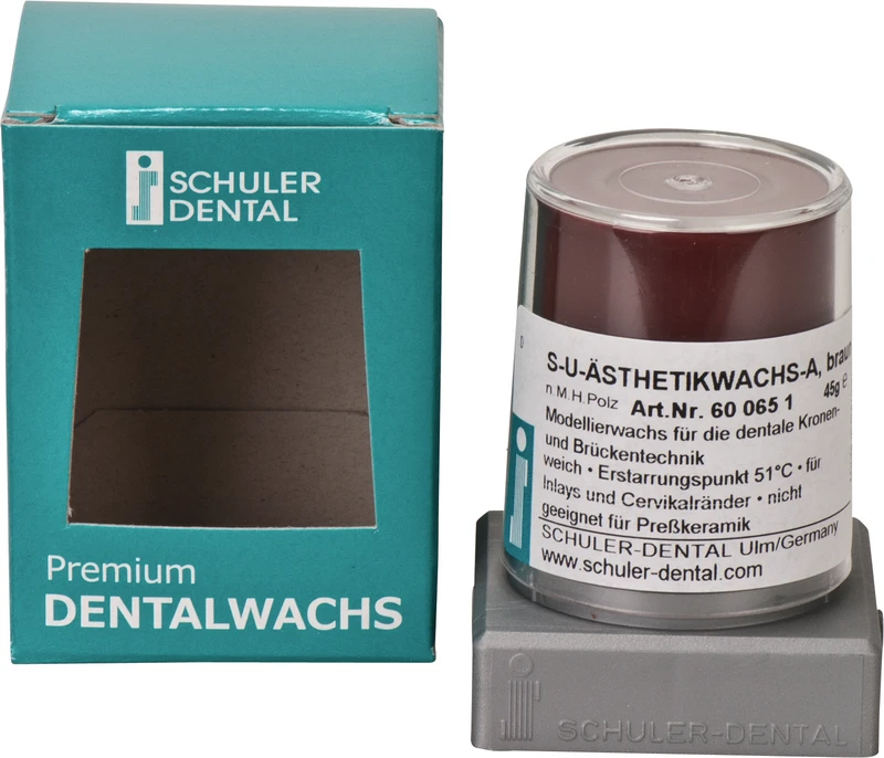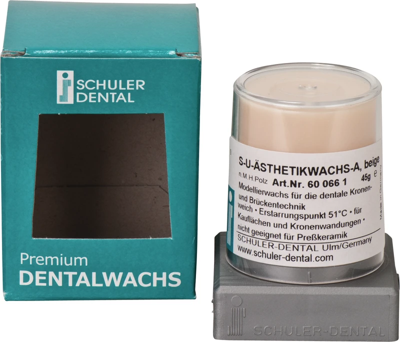 S-U-Ästhetikwachs-A inneholder en liten andel uorganiske fargestoffer, og er derfor opak i flytende tilstand. Dette gjør det for eksempel lettere for lærlinger å lære modelleringsteknikk. Ideell for støpsteknikk, ikke egnet for presskeramikk. Stivningspunkt 51 °C.