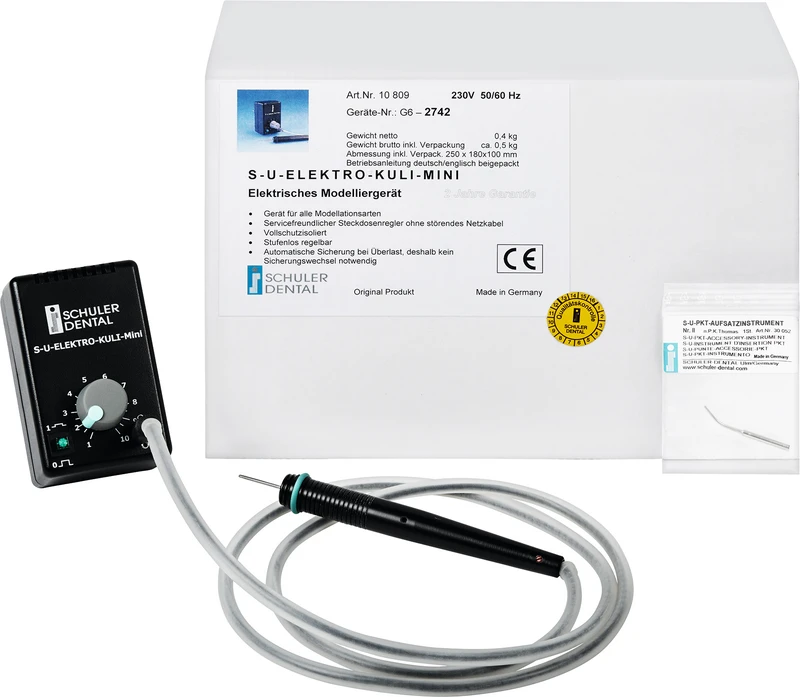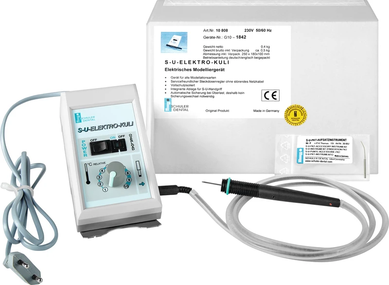 Enheten for alle modelleringsmåter med et vedlikeholdsoptimert, servicevennlig design i pultform. Ingen sikringsbytte etter en feil (overbelastning) nødvendig. Automatisk sikring som etter utbedring av feilkilden og en kort driftsstans setter S-U-ELEKTRO-KULI automatisk i drift igjen. Feil blir indikert. Fullisolert. Med integrert oppbevaring for modelleringshåndstykket S-U-HANDGRIFF.