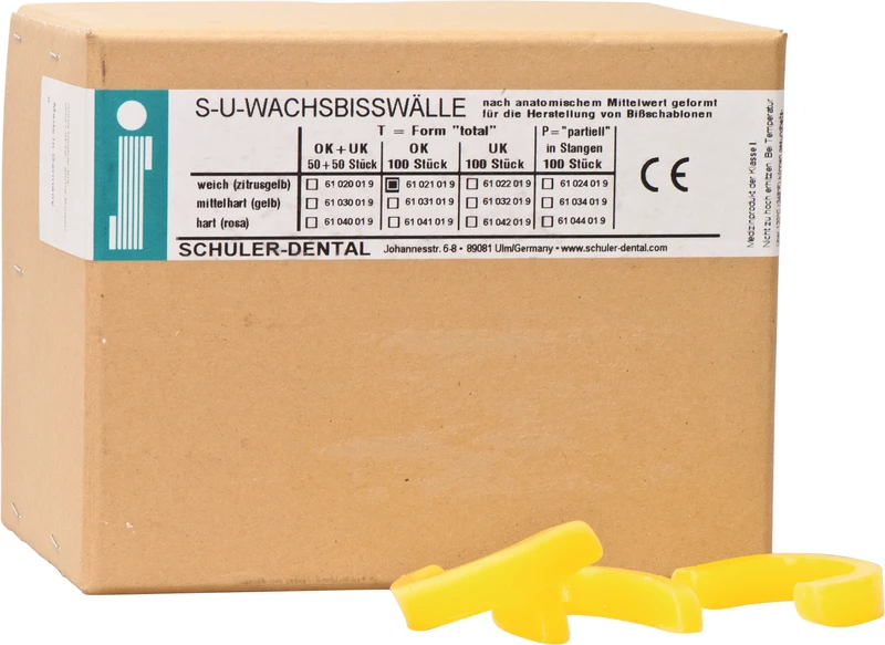 S-U-Wachsbisswälle „total” = „T” (myk, middels, hard) egner seg utmerket til fremstilling av totale bittsjablonger. De leveres spesielt for overkjeven i halvelliptisk og underkjeven i parabolisk form. Dermed bortfaller den tidkrevende omformingen av ferdigdelene. I formgivningen er dessuten den sagittale og transversale kompensasjonskurven tatt hensyn til. Labial er bittvulstene noe avsmalnede. Bittvulstene forblir i flateaktig kontakt ved lateral- og protrusjonsbevegelser. Dette gjør bittregistreringen enklere for tannlegen og pasienten. S-U-Wachsbisswälle „partiell” = „P” i stenger (myk, middels, hard) egner seg til fremstilling av partielle bittsjablonger samt til å settes på modellguss-sadler. De leveres i stenger på 110 x 10 x 6 mm.