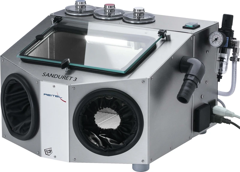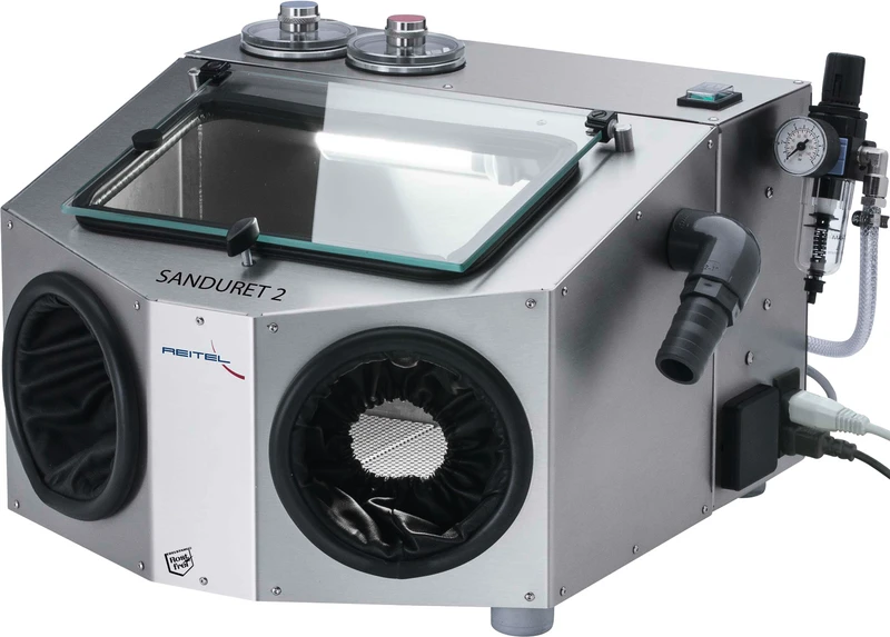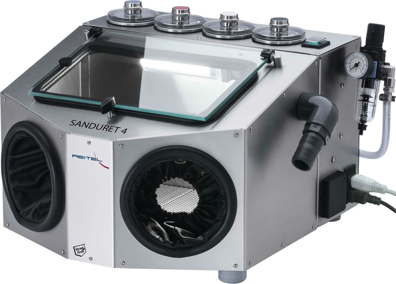 De mikrofine sandblåseapparatene i SANDURET-serien gir et optimalt blåseresultat med alle vanlige strømidler fra 25 til 250 µm. Bruksområdene er rengjøring, mattgjøring, polering og fjerning av oksid. En inngangstrykkregulering kombinert med mengderegulatorer og hurtigstopp gir lavt forbruk av strømiddel og ønsket resultat. Vannseparator og filter reduserer unødvendig vedlikehold og holder nedetid lav.