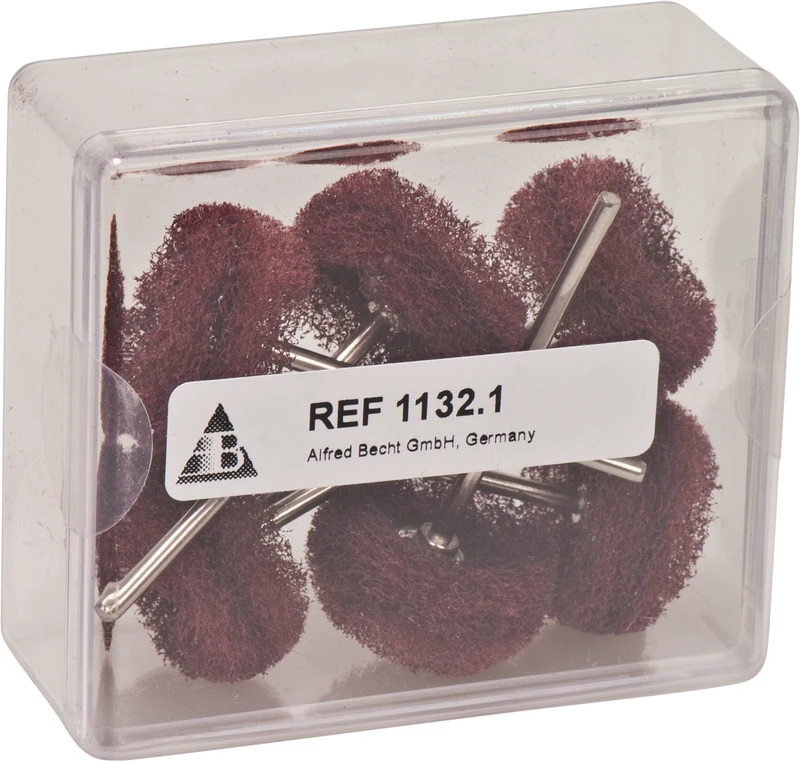 For målrettet glatting av plast og avtrykkskje-materiale, også egnet ved modellfremstilling og myke plastmaterialer. Et alternativ til slipepapir. Aluminiumoksid 25 mm Ø, montert for håndstykke. Anbefalt turtall: 1.400 – 10.000 U/min.