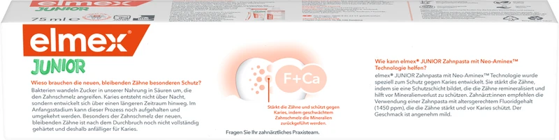 • Tilbyr effektiv kariesbeskyttelse for de nye, permanente tennene takket være aldersbestemt fluorinnhold (1.400 ppm)