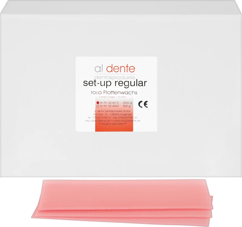 Gjennom den harmoniske kombinasjonen av bivoks, mikrovoks og parafiner møter al dente Set-up de høyeste krav. Den høye plastisiteten hindrer riving ved forming. al dente Set-up er lett å modellere og skjære. Ved forming trekker ikke al dente Set-up seg tilbake og har høy vedheft uten å klebe.