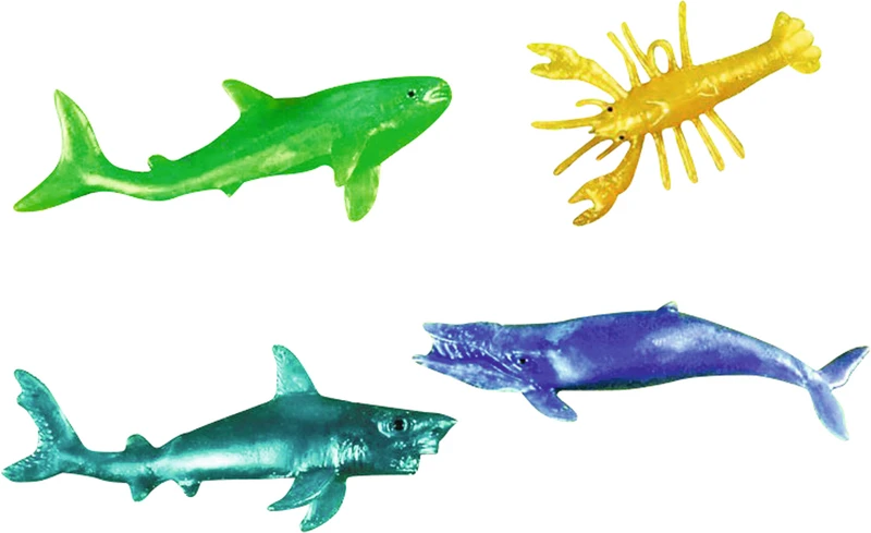 Ulike sjødyr (haier, hvaler, delfiner,…) av høyt elastisk materiale, 60 mm – 70 mm, kan strekkes til dobbel lengde.