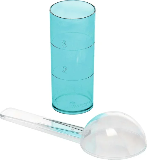 Pakke 1 skje transparent, 1 målebeger blå