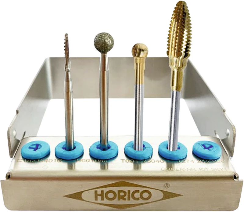 • 2 x karbidfreser belagt med titannitrid, ideelle for fjerning av alveolarbenet og for å skape plass for plassering av flere Abtuments. Den gullfargede belegningen gjør overflaten av fresene glattere – det er skånsommere for benvevet. Den beskytter også skjærekantene mot slitasje.