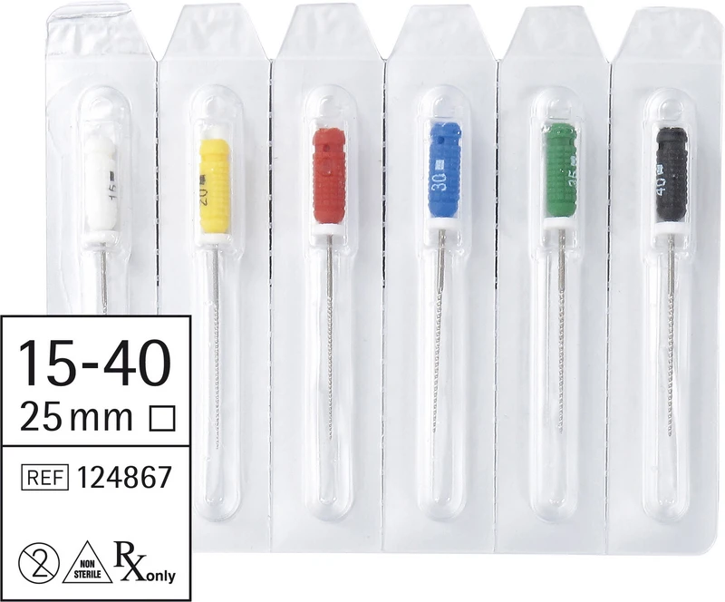 Høyverdig og ISO-konformt nøyaktig fremstilt endo-instrumenter “”Made by Sendoline””. De har en veldig god skjæreevne og høy bruddstyrke. Instrumentene er fargekodet etter ISO-størrelser og kan steriliseres opp til 200 °C. Grepet er sklisikkert takket være det ergonomiske gripeområdet, og instrumentet er dermed trygt å bruke. I en blisterpakke, som sikrer hygienisk enkeltuttak, finnes det 6 instrumenter som er utstyrt med en silikonstopper. Det er et engangsprodukt som krever sterilisering før bruk.