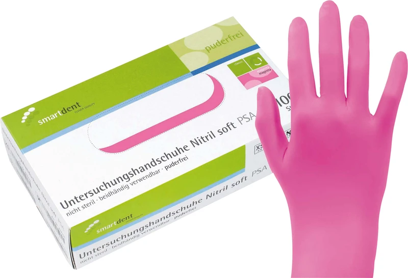 smartdent Nitril er en supersensitiv hanske i moteriktige farger. smartdent Nitril har utmerket bærekomfort takket være fremragende passform. smartdent Nitril er ekstra tynn og følsom, myk, smidig og lett å ta på og av. De mikroteksturerte fingertuppene sikrer ekstra fin følelse og sikkert grep. Produsert etter EN 455. EN 374. AQL 1,5. Pudderfri.