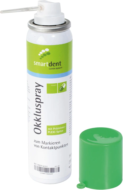 Mikropulverisert markørspray for å synliggjøre kontaktpunkter og -flater i dentalområdet. Farpigmentfilmen fjernes uten rester med vann og er lett å ta bort. Finnes i fargene grønn og rød.