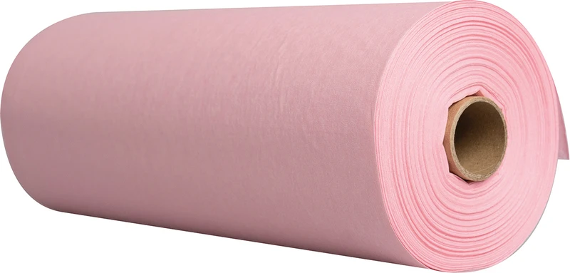Engangspasientomslag laget av tynn PE-folie med absorberende celluloselag. Med halsutskjæring og bånd. Format 54 x 60 cm.