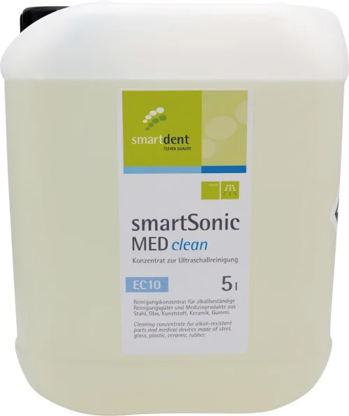 smartSonic MED clean EC 10 er et flytende, alkalisk universalrengjøringskonsentrat for grundig ultralyd- og dyprengjøring av alkalibestandige rengjøringsprodukter og medisinske produkter som f.eks. laboratorie-, medisinske, tannlege- og tanntekniske instrumenter, kroner, avtrykksskjeer m.m. av rustfritt stål, stål, keramikk, glass, plast og gummi. smartSonic MED clean EC 10 fjerner blod, spytt, proteiner, vevs- og beinrester samt fett, oljer, slipemidler og poleringspasta. Ikke egnet for aluminium, sink eller lettmetall-legeringer samt alkalifølsomme og spenningsrissutsatte plasttyper som f.eks. ABS og PC.