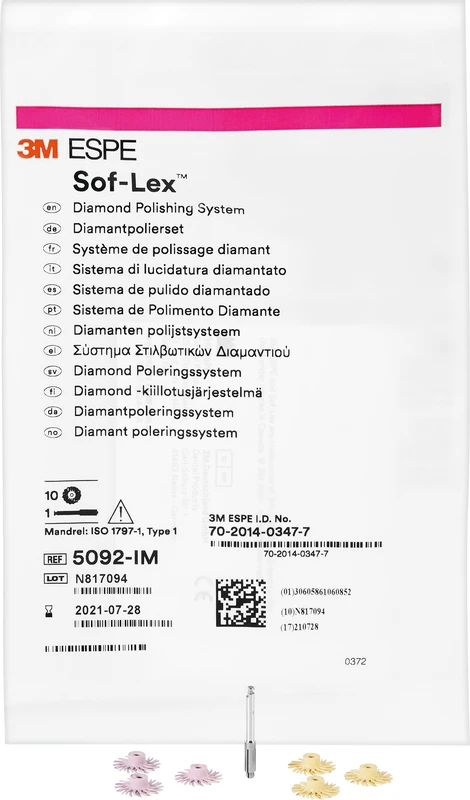 Det to-trinns 3M™ Sof-Lex™ poleringshjulsettet gir deg høyglanspolering uten poleringspasta. I første trinn glatter du med 3M™ Sof-Lex™ forpoleringshjul beige restaureringsoverflaten; spor og rester som oppstår ved konturering fjernes. I det andre trinnet av behandlingen gir 3M™ Sof-Lex™ diamantpoleringshjulet rosa restaureringen høyglans.