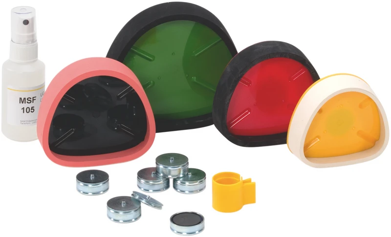 • Utstyr: plast formplate med fire stråler, gummiring (høyde tilpasset AXIOPIN), seks magneter, seks beholdere, seks festeplater, magnetløfter