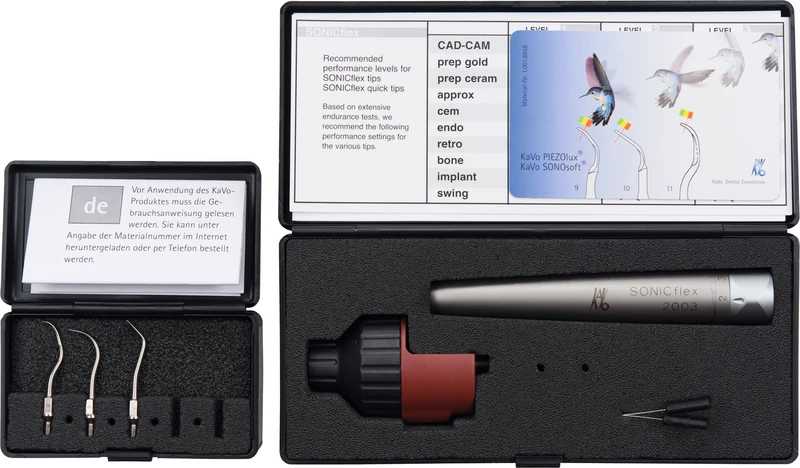 - Set SONICflex 2000N mit Scalerspitze Nr. 5: For alle anvendelser, fra profylakse til kirurgi, over 50 spisser, frekvens: 6.000 Hz, passer til KaVo MULTIflex-kobling, bevegelsesretning: sirkulær