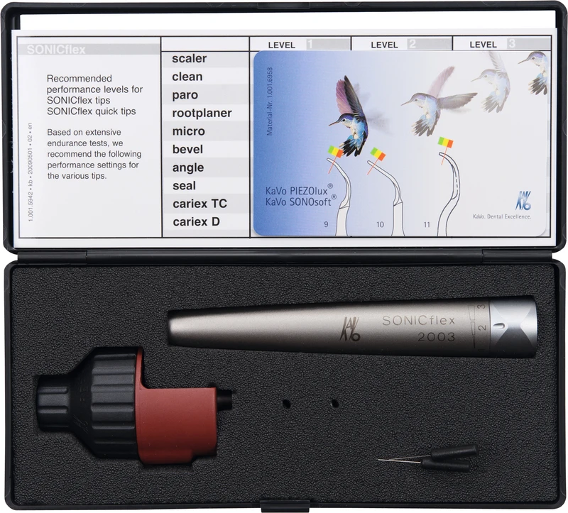 - Set SONICflex 2003 Handstück ohne Licht mit Scalerspitzen Nr. 5/6/7: For alle anvendelser, fra profylakse til kirurgi, over 50 spisser, frekvens: 6.000 Hz, 3 justerbare effektnivåer, passer til KaVo MULTIflex-kobling, bevegelsesretning: sirkulær – PUD-overflate: fremragende grepfølelse og beste hygieniske vedlikehold