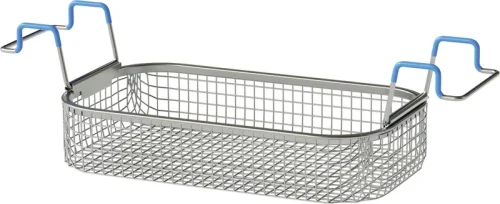 Tilbehør for SONOREX-enheter. For å ta opp beskyttelsesgods; laget av rustfritt stål. Under ultralyddrift må ingenting plasseres på bunnen av badet, da det kan oppstå slitasje mellom beskyttelsesgods og ultralydsvingbadet. Det anbefales derfor å bruke en passende kurv for å ta opp beskyttelsesgods. BANDELIN-kurvene er konstruert slik at beskyttelsesgods alltid befinner seg i det optimale området av kavitasjonsfeltet (1-2 cm fra bunnen) i svingbadet. Ved hjelp av en kurv kan beskyttelsesgods også plasseres komfortabelt i enheten og tas ut etter driften, f.eks. for skylling, uten at brukeren kommer i kontakt med beskyttelsesvæsken i svingbadet.