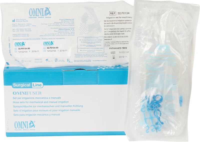 Sprayslange systemer. Riktig vanning med en kjølevæske under posisjoneringen av implantatet er viktig for dets innheling og den tilknyttede suksessen. De mekaniske irrigasjonssystemene fra OMNIA har følgende alternativer: a. Monoirrigasjon innvendig b. Monoirrigasjon utvendig c. Innvendig og utvendig irrigasjon Det praktiske endestykket gjør det lettere å koble irrigasjonsledningen til håndstykket og tillater tilkobling av våre slanger til alle nåler for kjøling av de forskjellige håndstykkene, som ofte har forskjellige diametre.