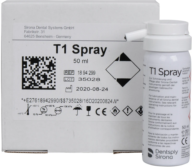 Spray for rengjøring og pleie av Dentsply Sirona turbiner samt hånd- og vinkelformede instrumenter.