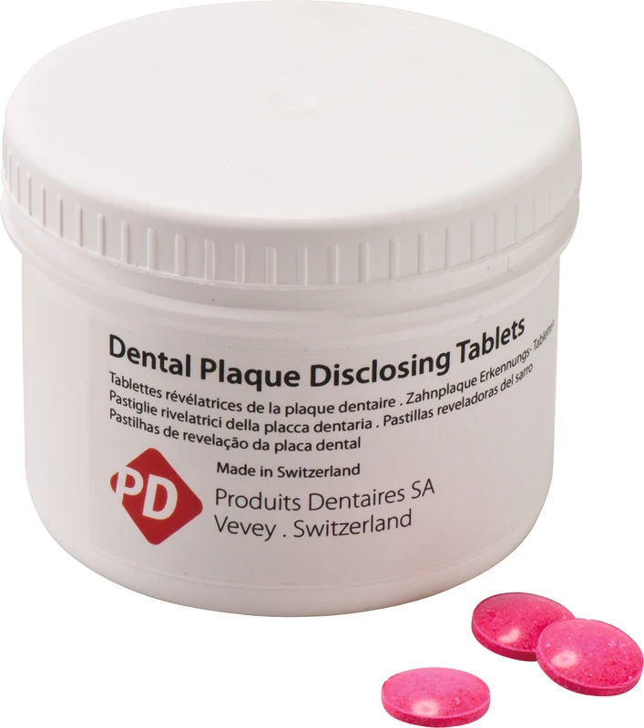 Tablettene gjør det mulig, uten terapeutisk eller profylaktisk behandling, å påvise tilstedeværelsen av plakk. Lett tilknyttet tannplakk farges rødt.
