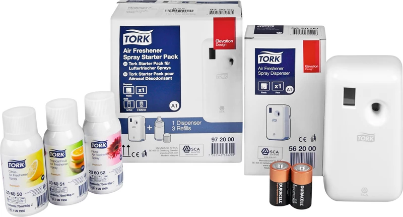 Den TORK® dispenseren for luftfriskerspray kjennetegnes ved funksjonalitet ned til minste detalj og er ikke bare praktisk, men også lite vedlikeholdskrevende. Startsettet inneholder etterfyllingspakninger med ulike dufter som skaper en behagelig atmosfære på toalettet.